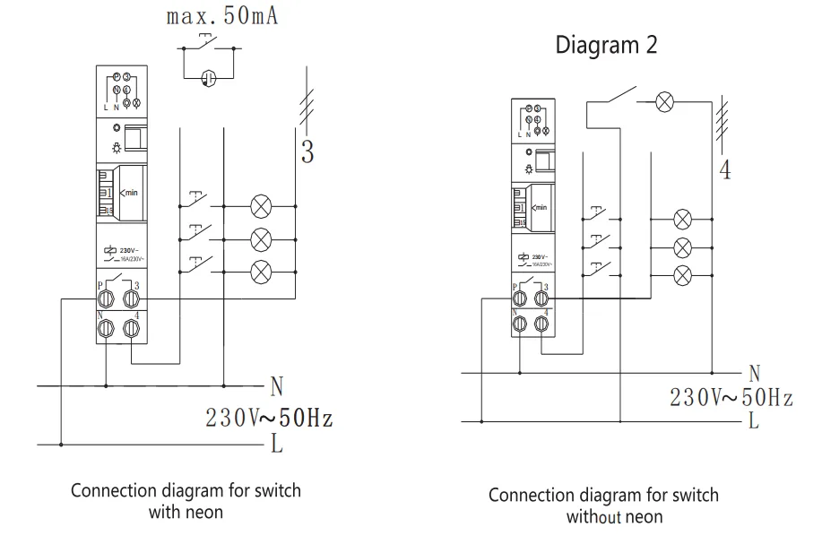 2. Часовий перемикач дозволяє підключатися до вимикача (з або без неонового світла).